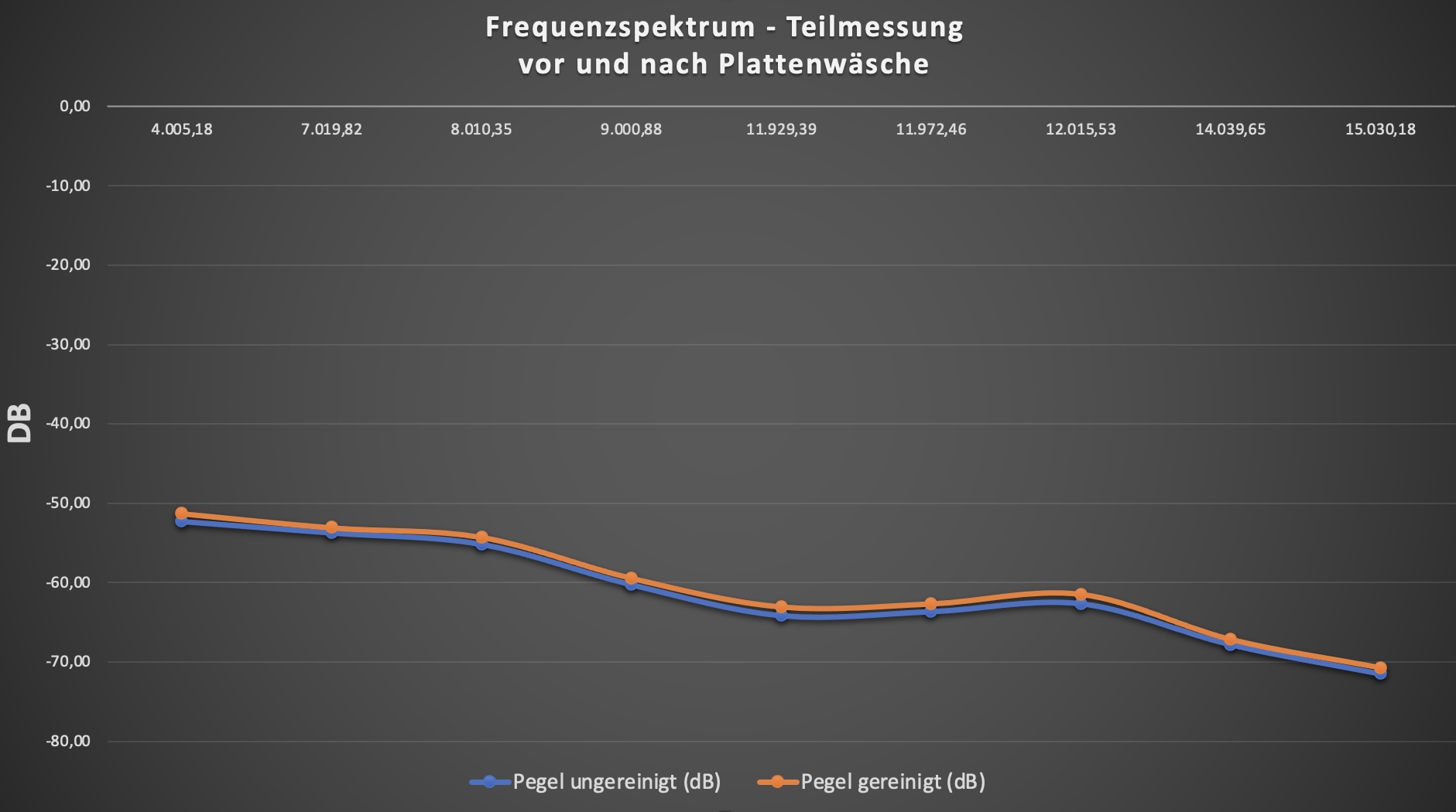 In der Auswertung, die wir oben grafisch darstellen, ist zu sehen, dass die blaue Linie um etwa 1 db leiser ist, als die orangene. Die blaue Linie zeigt die unbehandelte Platte, die orangene Linie zeigt die gewaschene Platte.