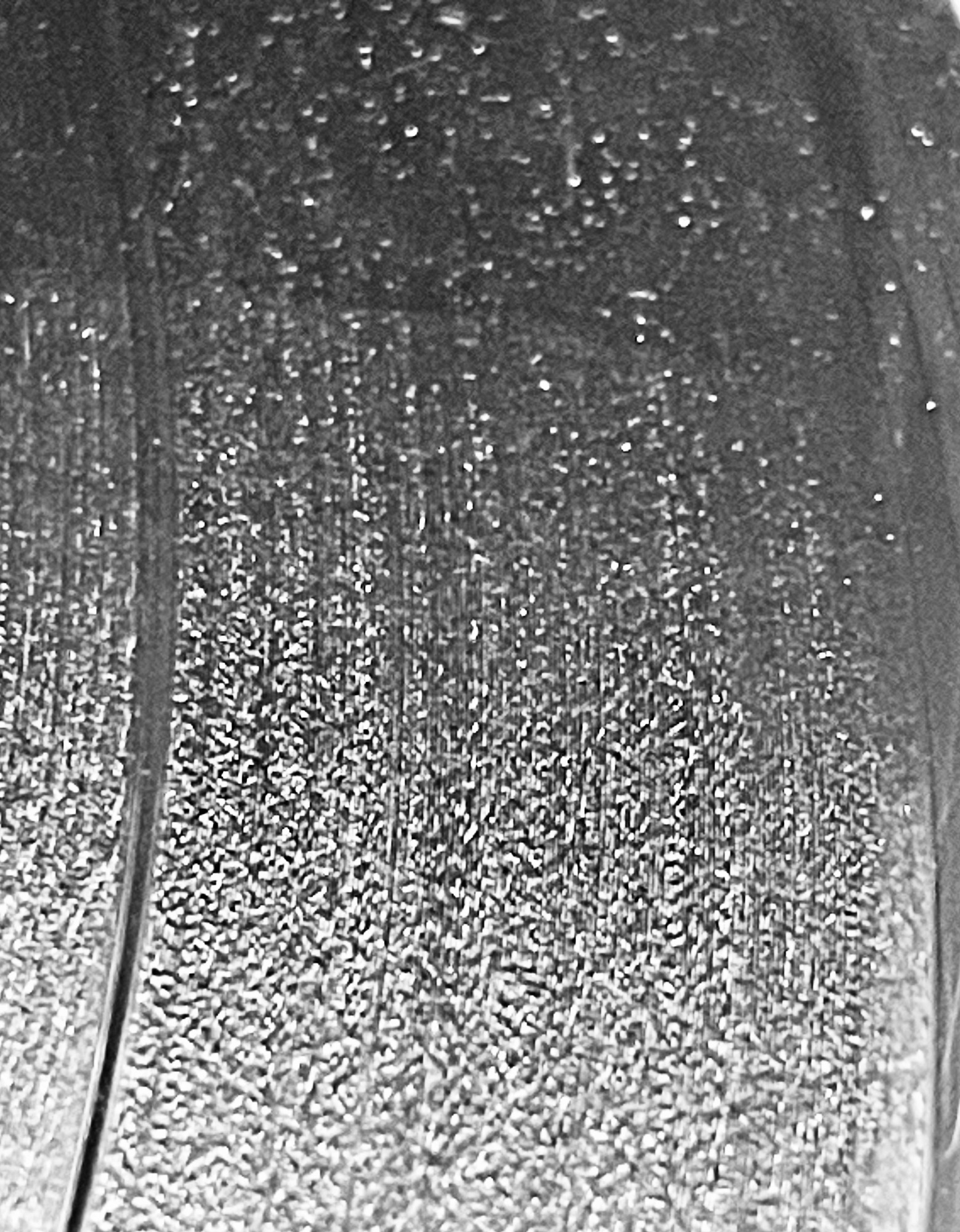 Hier haben wir ein gutes Beispiel einer nicht gereinigten und "frischen" Flohmarkt-Platte. Die Verschmutzungen auf der Oberfläche sind deutlisch zu erkennen. Würden wir jetzt mit einer 40-fachen Vergrößerung bis in die Rille reinschauen, würden wir auch dort die Schmutzpartikel deutlich erkennen können.